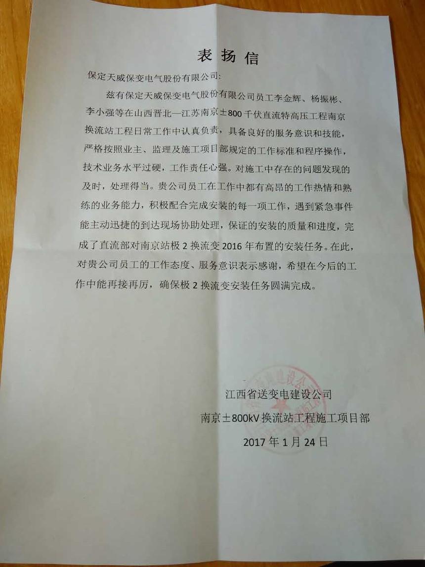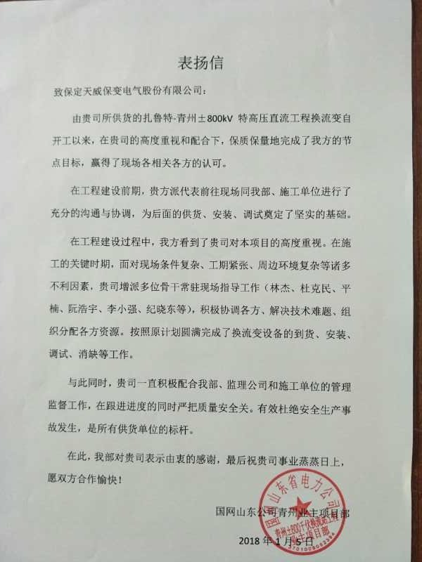 近期,保定天威保變電氣股份有限公司先后收到了國家電網(wǎng)公司、中國核電工程有限公司、江西省送變電建設(shè)公司、越南永新一期EPC聯(lián)合體項(xiàng)目部向保變電氣發(fā)來表揚(yáng)信和感謝信,對(duì)保變電氣優(yōu)質(zhì)的產(chǎn)品售后服務(wù)表示感謝。